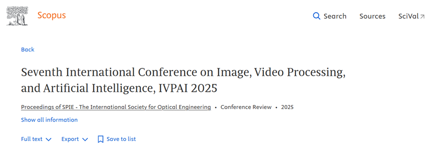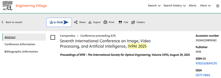 Proceedings of IVPAI2025, IVPAI2024, IVPAI2023, IVPAI2021, IVPAI2020, IVPAI2019 and IVPAI2018 were published in SPIE Digital Library successfully. The Proceedings of this conference are published along with nearly 500,000 papers from other outstanding conferences, SPIE Journals, and chapters from SPIE Press books.